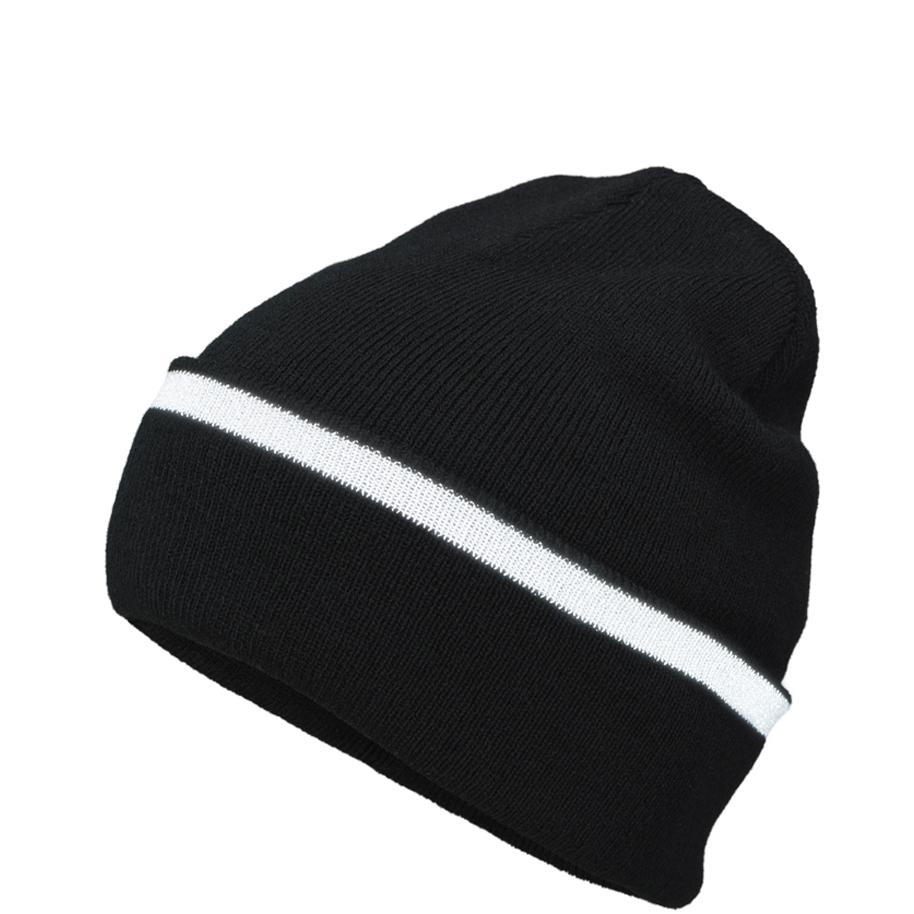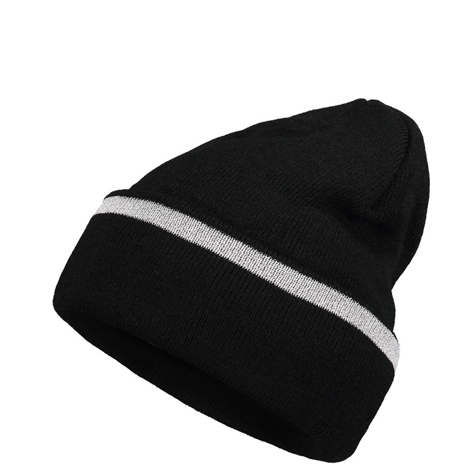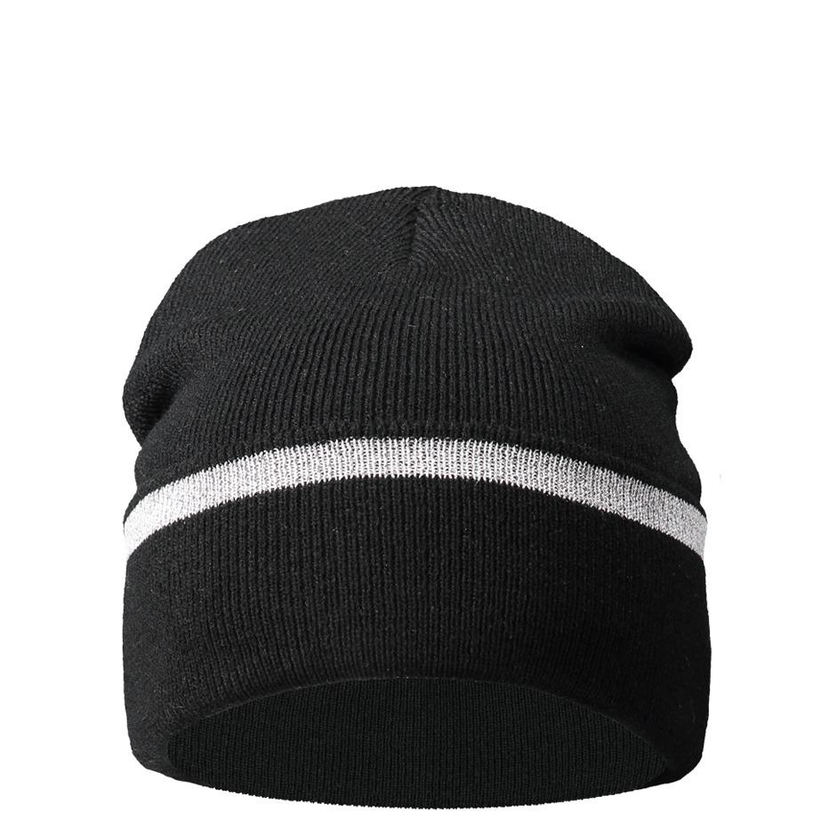 Kaksinkertainen pipo on mustaa sileää neuletta ja käänteeseen on neulottu heijastava raita. Pidempi malli antaa mahdollisuuden kääntää reunaa reilusti tai jättää pipon roikkumaan rennosti takaraivolle. Tämä pipo pitää pään lämpimänä kylmälläkin säällä.