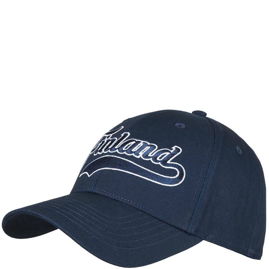 Finland baseball lippalakki. Edessä 2D -brodeeraus, takana Suomenlippu -saumamerkki sekä EST. 1917 2D -brodeeraus.