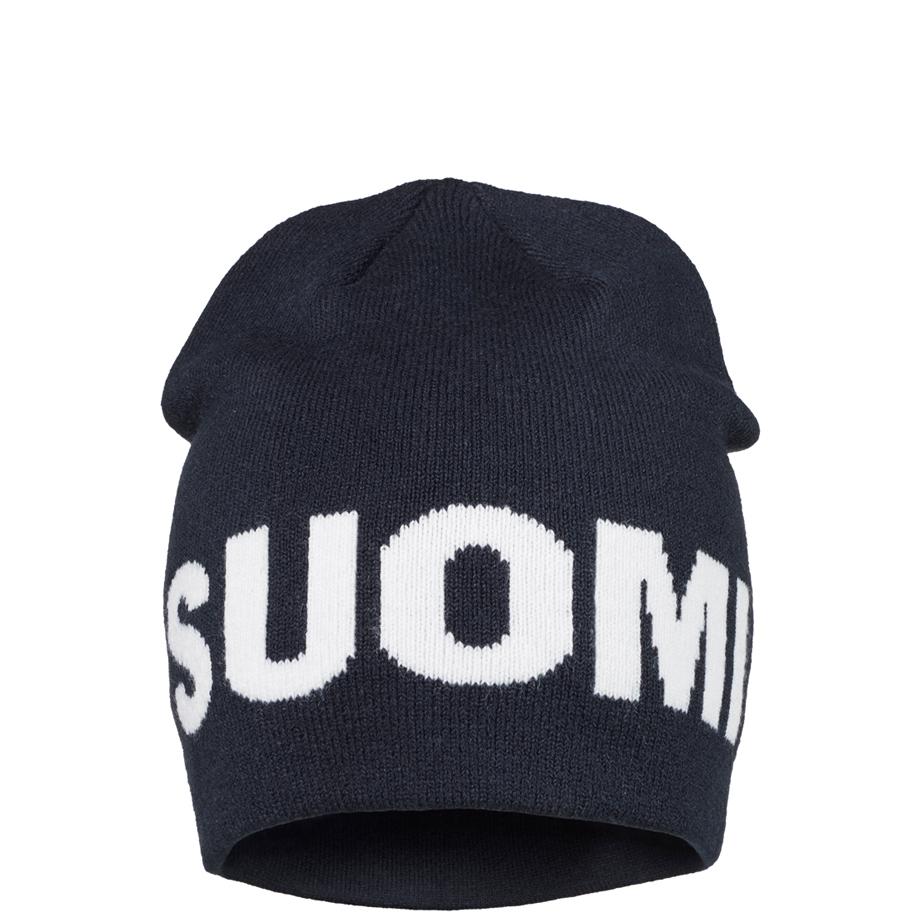 Tyylikäs Suomi pipo jacquard neulotuilla suomiteksteillä.